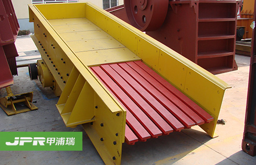振动给料机在砂石生产线中可为破碎机连续均匀地喂料避免破碎机受料口的堵塞。振动给料机机是利用振动器中的偏心块旋转产生离心力,使筛厢、振动器等可动部分作强制的连续的圆或近似圆的运动。物料则随筛厢在倾斜的筛面上作连续的抛掷运动,并连续均匀地将物料送至受料口内。