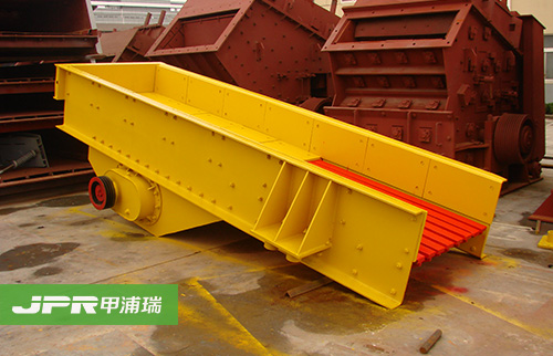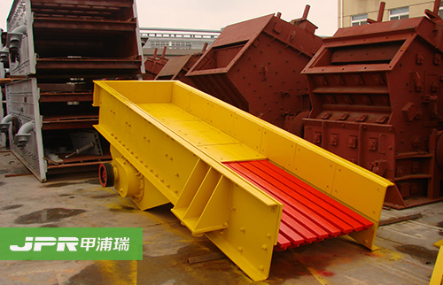 振动给料机在砂石生产线中可为破碎机连续均匀地喂料避免破碎机受料口的堵塞。振动给料机机是利用振动器中的偏心块旋转产生离心力,使筛厢、振动器等可动部分作强制的连续的圆或近似圆的运动。物料则随筛厢在倾斜的筛面上作连续的抛掷运动,并连续均匀地将物料送至受料口内。